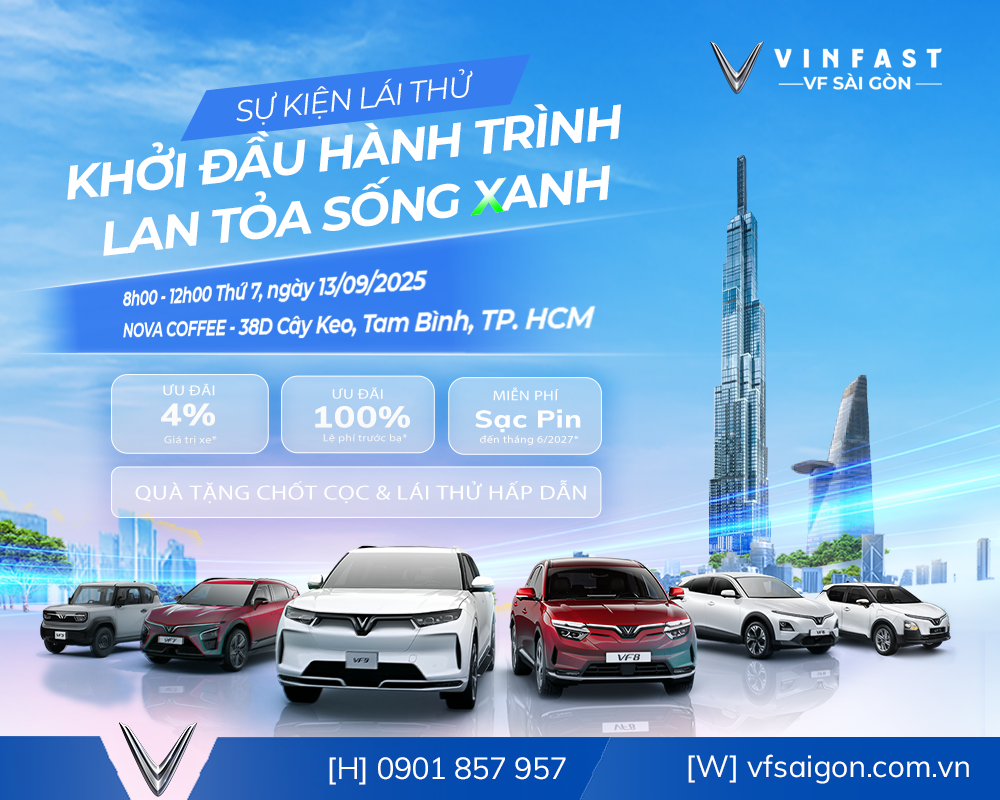Nhằm mang đến cho Quý khách hàng những trải nghiệm thực tế và chân thật nhất về các mẫu xe điện mới, VinFast VF Sài Gòn tổ chức sự kiện lái thử xe điện VinFast vào ngày 13/09/2025 tại NOVA Coffee, TP. HCM.