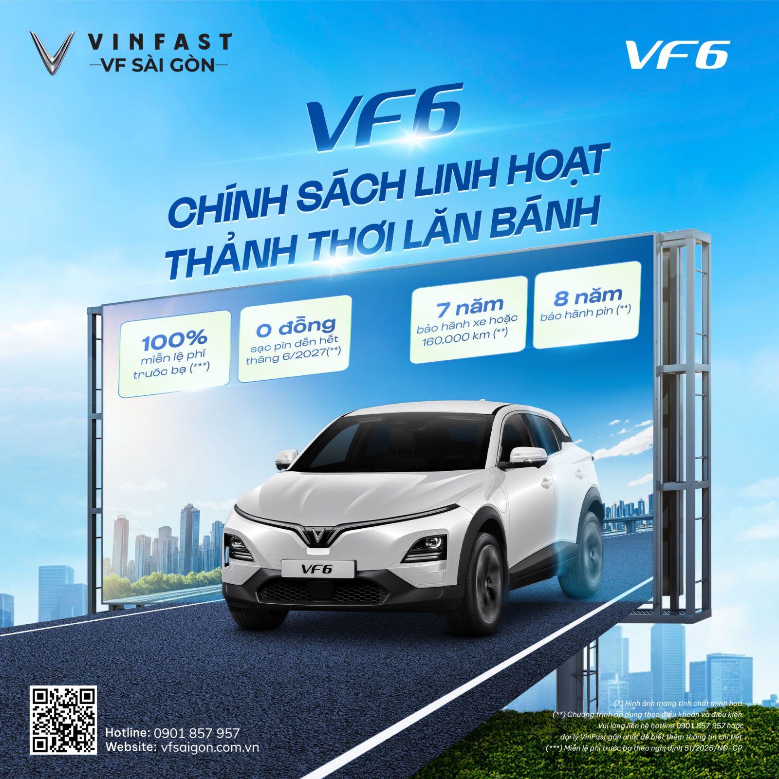 Với chính sách tài chính linh hoạt, ưu đãi khủng và chế độ hậu mãi toàn diện, VF 6 không chỉ là một chiếc xe, mà còn là người bạn đồng hành đáng tin cậy trên mọi hành trình.