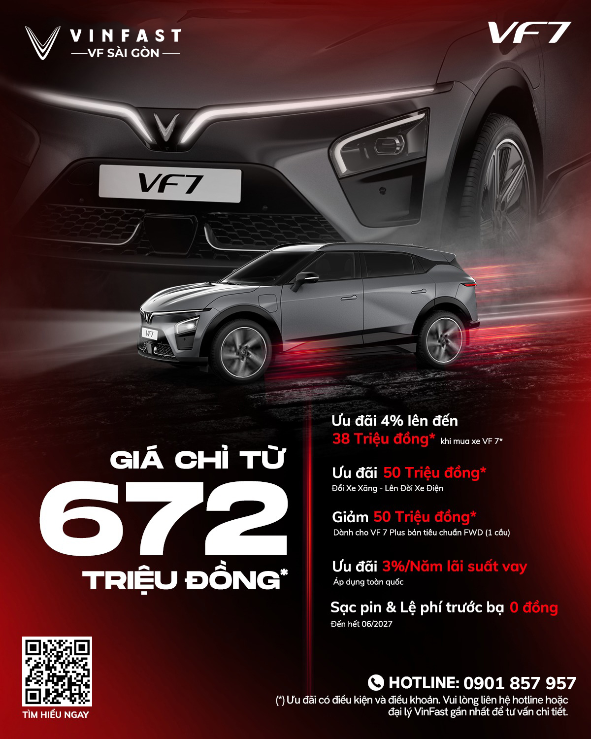 VinFast VF Sài Gòn mang đến chương trình ưu đãi cực khủng, giúp bạn dễ dàng sở hữu VinFast VF 7 – mẫu xe điện đậm chất thời đại, đầy công nghệ và phong cách – với giá chỉ từ 672 TRIỆU ĐỒNG*.